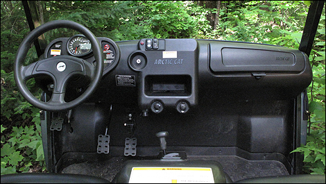 Le Prowler XTX 700 H1, le modèle le plus cossu chez Arctic Cat, accueille bien ses occupants, avec tout ce qu’il faut pour de longues randonnées en tout confort. On y retrouve des sièges bien moulés, des ceintures de sécurité, le volant réglable en hauteur, le plancher plat laissant beaucoup d’espace pour les jambes, une prise 12 volts à portée de main, la console centrale avec porte-gobelets intégrés, et un grand réservoir à carburant de 31 litres. La cabine à ciel ouvert, avec sa cage de protection pour les occupants, dispose d’un coffre à gants, des compartiments de rangement dans le tableau de bord, et d’une trousse à outils placée sous le siège du passager.