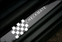 Le Checkmate est l'un des quatre différents ensembles offerts par MINI autour du monde en 2006. Tout d'abord, il y a l'ensemble Park Lane, pour la Cooper régulière, qui ajoute un élégant accent typiquement britannique. Vous obtenez des garnitures en cuir semblables à celles des Jaguar sur les sièges, une patine spéciale à effet 3D, et des appliqués de chrome à l'intérieur comme à l'extérieur, sans oublier les roues spéciales en alliage et la peinture de couleur gris royal. Non, vous n'avez pas droit au service à thé assorti aux porte gobelet, ou aux paniers à pique-nique en osier intégrés au compartiment de chargement arrière, même si ceux-ci faisaient partie intégrante du prototype MINI Tourer de Tokyo. Il y a aussi la Seven, qui ajoute un peu de cran au modèle de base MINI One de 90 chevaux (non disponible en Amérique du Nord), ou à la One D (à moteur diesel) en y ajoutant une peinture rouge soleil qui contraste avec des touches de ton noir lustré, des garnitures intérieures d'allure de touches de piano et un motif correspondant pour les sièges.