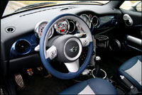 que nous parlions de quelques nouveaux ajouts pour 2006. Avec la Cooper S, vous pouvez maintenant profiter de phares automatiques qui s'allument d'eux-mêmes selon le niveau de luminosité ambiante à l'extérieur, de buses de lave-glace chauffantes, d'essuie-glace automatiques qui balaient dès les premières gouttes de pluie, et d'une lampe-témoin, montée au levier de commande des essuie-glace, qui vous avertit du niveau bas de liquide lave-glace. Aussi en nouveauté, la possibilité d'obtenir des autocollants de toit, pour les modèles munis du toit panoramique, et un témoin d'avertissement pour le coussin gonflable du passager situé au pavillon, à la vue de tous. Une chose qui n'a pas été ramenée de la dernière mise à jour de 2005 est l'horloge. À moins que je sois aveugle.