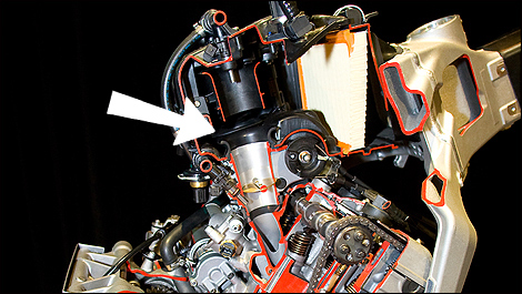 The arrow shows the lower, fixed short intake stack. The extension is poised above it, waiting for the ECU to tell it to go down and mate with the base, to favour low rpm flow, and thus torque.