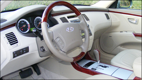 The "flair" quotient is produced with the use of satin steel appliques and woodgrain trim. These tastefully restrained elements carry the otherwise bland styling upscale by adding a touch of class. Overall, the Azera's cabin is an exercise in relaxation and comfort.