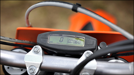 The hard seat lends itself to aggressive trail riding and supplies a minimum amount of comfort on long outings, but like most enduro bikes, its high, 985-mm perch can be disheartening for less than expert-level riders. Beginners or shorter owners may want to lower the machine a bit to facilitate putting a foot out when cornering. The dash delivers all the information required for racing, while the tapered handlebars are three-way adjustable. What’s more, the 250 XCF-W comes with a switch and all the necessary wiring to install head and tail lamps.