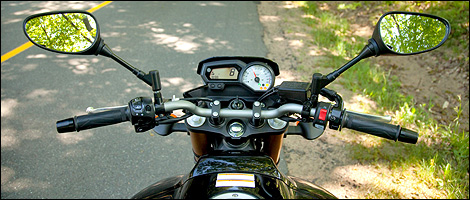 Analog tach dial, digital speedo and mostly icons for the other information. Love those big and nicely spaced out mirrors. (Photo: Yamaha)
