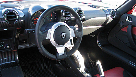 This type of car has very specific requirements and two of them are fixed-back race-inspired seats and a small diameter three-spoke leather-wrapped MOMO sport steering wheel. This means then that once you've gotten past the sweet, sensual curves of the carbon-fibre body, the cabin is all business and matches the drapes. With doors open, crossing the threshold requires a little work but hey, if you can't get in, too bad!