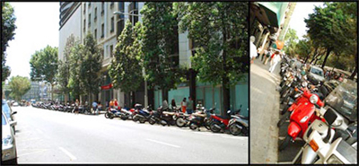 Lors d'un récent voyage, j'ai pu réaliser combien les scooters barcelonais étaient gâtés et acceptés par les autorités de cette ville. Sur les grandes artères ou aux abords des grands boulevards, on réserve une voie entière au stationnement des scooters et des motos. Une photo vaut mille mots, dit-on : en voici quelques-unes. Peut-être me direz-vous que, là-bas, on peut profiter des scooters douze mois par année ? Certes. Mais si l'on nous accordait des espaces de stationnement décents et le droit d'utiliser ceux des parcomètres en diagonale à plusieurs, tous en profiteraient. Certes, notre climat limite l'utilisation de nos deux-roues sept ou huit mois par an. Mais de tels incitatifs nous permettraient de profiter de cette période pour aller au boulot au lieu de se limiter aux week-ends. Certains centres commerciaux commencent à comprendre et offrent des espaces aménagés à cet effet. Espérons qu'on finira par comprendre... On a le droit de rêver, n'est-ce pas ?  | | Barcelone : des espaces réservés au stationnement des motos et des scooters au même titre que les automobiles (Photo: Amyot Bachand) |