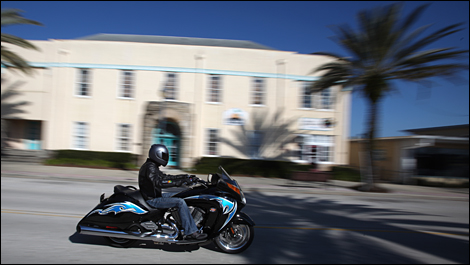 Le moteur bicylindre en V de 106 pouces cubes, toujours aussi doux et bourré de couple, nous catapulte à bas régime, tandis que la boîte à six rapports nous en donne cinq pour usage courant, et un très long rapport pour la haute vitesse sur l’autoroute. Fidèle à la réputation de Victory, la qualité d’assemblage de la monture s’avère pour le moins remarquable.