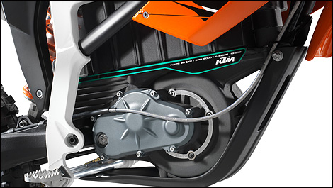 | La simplicité même: une batterie haut placée, un ordi et rechargeur cachés, le petit moteur, et sa toute simple transmission finale. (Photo: KTM) |