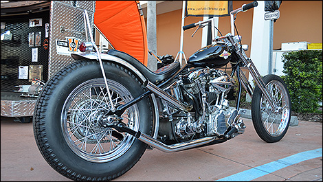 La cruiser custom de la fin des années 60 au style « hippie » avec sa selle banane, sa fourche de type « springer » sans garde-boue et son démarreur au pied.