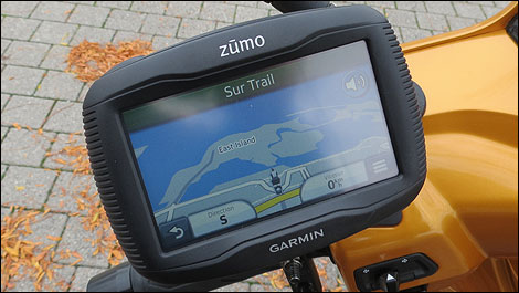 L’écran tactile sensible et la configuration du clavier à grosses touches permettent de faire les tracés aisément, même avec des gants. Cette dernière n’exige que le numéro et le nom de la rue : on vous donne le choix des villes et provinces ou états. La visibilité est excellente et résiste bien aux reflets du soleil. La luminosité s’ajuste et le haut-parleur est assez puissant pour entendre les directions données. Les directions cartographiques en 3D se lisent aisément d’un coup d’œil. On peut opter pour une liaison Bluetooth avec casque d’écoute également. De plus, le système permet de trouver rapidement une station d’essence ou un resto; il se souvient du dernier trajet, du dernier stationnement et permet de programmer un itinéraire multiple et évidemment vos favoris. Le plus utile pour moi fut la lecture de vitesses réelles des machines à l’essai. On compte également sur une fonction compas, backtrack, horloge-réveil-matin et calculatrice. On peut ajouter en option l’info trafic et un lexique multilingue.