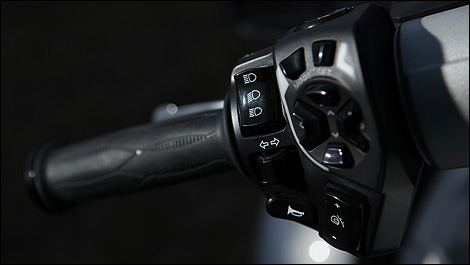 | Le commodo gauche, qui comprend les commandes pour clignotants, phare, hauteur du pare-brise, klaxon, système de son et autre électronique, et changement de rapport pour la boîte SE5 le cas échéant. (Photo: Philippe Champoux/Auto123.com) |