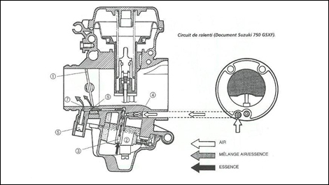 Il a comme rôle de faire entrer l'air en le déviant par un conduit qui prend son ouverture du côté du boîtier du filtre à air. Le boisseau étant en position de fermeture complète, à la position de ralenti. Au démarrage, le moteur crée une dépression entre le boisseau et la chambre de combustion. L'ouverture de ce circuit provoque l'aspiration du carburant dans la cuve par un passage qu'on appelle orifice d'émulsion. Cela ressemble à une petite paille; le carburant y est aspiré et monte en se mélangeant à l'air. Ce mélange est enrichi, et il n'est pas nécessaire de donner les gaz. Il faut attendre que le moteur se réchauffe, ce qui ne prend qu'une minute ou deux. Baissez le levier de l'étrangleur et fermez complètement dès que le régime moteur se stabilise.