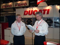 | Gary Eagan (gauche) et Christian Touchais (droite) nous accueillent au kiosque de Ducati lors du dernier Salon de la moto de Montréal. (photo Mathieu Germain, Moto123.com) |
