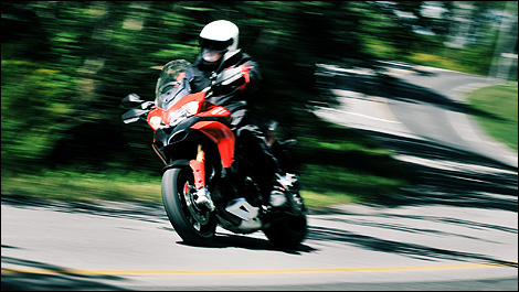 Côté performances, rien à reprocher à la belle 1200. La Multistrada se veut cependant polyvalente, à l’aise en roulage sportif – on le sait ! – mais aussi à 70 Km/h et 3000 tours/min, alors que dans les faits, elle agit à basse vitesse comme un cheval fou qu’on retient inutilement. Le moteur n’aime pas tourner sous les 3000 tr/m, vous forçant à rétrograder pour retrouver sa douceur de roulement. Vous retrouvez alors toute la nervosité du moteur, mais attention, car le moindre mouvement du poignet se traduit par une accélération instantanée. Elle a le défaut de sa qualité : de la puissance tant que vous en avez besoin, et tout de suite, merci !
