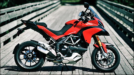 En plus de ses performances explosives, la Multistrada est une très belle moto qui attire le regard avec son look multisegments comment dire… inhabituel. On vous regarde un peu drôlement aux feux de circulation, ne sachant pas trop à qui et à quoi on a affaire. Si on comparait la Multistrada à un véhicule, je dirais Porsche Cayenne Turbo : performante à souhait, plus qu’à l’aise sur le bitume, capable de faire un peu de hors-route, et dotée d’une gueule d’enfer. On a d’ailleurs un peu sacrifié le côté pratique des sacoches pour qu’esthétiquement elles puissent se marier avec la ligne de cette Ferrari des motos.