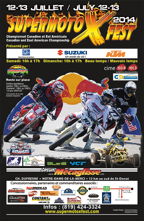 Les 12 et 13 juillet prochain se tiendra, au circuit Mécaglisse de Notre-Dame-de-la-Merci, la 8e édition du Supermoto X Fest. Rappelons que la course compte pour le Championnat National Canadien et, nouveauté cette année, également pour le Championnat AMA Est Américain.