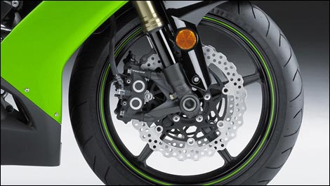 Frein et moteur de haute performance Les ingénieurs n'ont pas négligé pour autant le système de freinage. La ZX-10R est dotée de deux disques semi-flottants en forme de pétale de 310 millimètres avec corps d'aluminium et des étriers à montage radial à 4 pistons opposés à l'avant. Un seul disque en forme de pétale de 220 millimètres à étrier à simple piston s'occupe de la roue arrière. La ZX-10R est animée par un moteur à 4 cylindres en ligne refroidi par liquide de 998 cc. Son taux de compression de 13 : 1 est l'un des plus élevés de l'industrie. Ce moteur à double arbre à cames en tête et à 16 soupapes est muni d'un système d'injection électronique de carburant doté de 4 corps de papillon de 43 millimètres. La réponse des gaz a été améliorée par l'installation d'injecteurs secondaire, l'utilisation de corps de papillon ovales et la forme nouvelle des conduits d'admission. Ces transformations confèrent au nouveau moteur un potentiel très proche de celui des motos de compétition d'usine de Kawasaki. Un style percutantLa ZX-10R affiche un tout nouveau style à la fois pur et moderne. Elle présente des lignes plus acérées que sa devancière, des lignes aussi pointues que les performances annoncées par le fabricant. L'échappement sort d'une façon plus traditionnelle, cependant, il arbore un nouveau style européen percutant. Le nouveau bras oscillant moderne et très imposant en dit long sur le travail qui a été effectué au chapitre de la stabilité et de la tenue en courbe. Contrairement à ce qu'on a l'habitude de voir sur une moto sportive de pointe, son nouveau carénage laisse entrevoir une bonne partie de son anatomie, ce qui lui confère un style encore plus racé. La nouvelle monture de pointe de l'équipe Kawasaki ne fait plus dans la dentelle. Elle est sur la ligne de départ, prête à s'attaquer aux meilleures de la catégorie. Une chose est sûre, elle dispose de tout ce qu'il faut pour gagner. Photos : Kawasaki