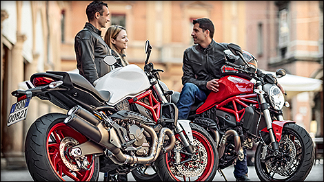 Équipée d’un moteur 821cc de 112 chevaux refroidi au liquide, la Monster 821 arrivera chez les concessionnaires en juillet prochain au prix de 12 490 $ pour les versions rouge et blanc satiné, et à 11 990 $ pour la Monster 821 Dark, cette dernière étant également munie de jantes noires.