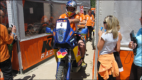 Cyril Despres se préparant pour une démonstration de la KTM 690 de rallye similaire à celle sur laquelle il a gagné le Paris-Dakar, et auxquelles on a enlevé les réservoirs externes essentiels pour la course dans le désert.