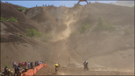 | Voici la poste de contrôle 17 où Doug Lampkin a connu des difficultés sous nos yeux. On peut le voir avec les sauveteurs, directement sous l'hélico entre les roches et l'herbe. On apercoit aussi deux pilotes sur leur machines, dont Cory Graffunder (5ième au final), qui attendent que le tracé soit dégagé pour continuer. |