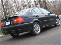 Un seul coup d'oeil rapide à la voiture est nécessaire pour que son identité nous soit révélée. Comme c'est souvent le cas avec les Allemandes, les BMW se distinguent de la masse par des traits caractéristiques qui ne démentent pas. Parmi ceux-là, on dénote la calandre distinctive avec la grille séparée en deux parties, les roues avant placées à l'extrémité du véhicule, ainsi que les glaces latérales arrière possédant ce petit coup de crayon inversé, à la jonction de la ligne du toit et de la ceinture de caisse. Esthétiquement très réussie, cette voiture démontre aussi sa beauté par le fait que malgré son âge, elle n'a pris aucune ride. Certains diront sans doute qu'ils attendent avec impatience le nouveau modèle, mais force est d'admettre que celui qui nous est offert actuellement figure parmi les designs automobiles les plus réussis des dix dernières années. Extérieurement, la Série 3 démontre une qualité d'assemblage et de finition qui satisfait les plus rigoureux en la matière.