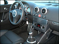 When it comes to loading the TT with options, there isn't much to choose from because most of what anyone could want is already there, such as self leveling xenon headlights, fog lights, Nappa leather seating, climate control, power windows, cruise control, remote locking and a driver information display. But nonetheless, larger 18-inch alloy wheels are available along with a premium 6-disc audio system, HomeLink, an Alcantara-covered steering wheel and a small-screen navigation system. In keeping with the TT's stretch and twist ergonomics, Audi has placed the 6-disc CD stacker in a slot situated in the sidewall on the driver's side next to the rear seat. Now I'm certain little space exists elsewhere, but this is a particularly nasty locale, which can only be accessed when standing outside the car, leaning into the driver's door and twisting to the right. A chiropractor on retainer may not be a bad idea, but better would be to integrate the multi-disc changer directly