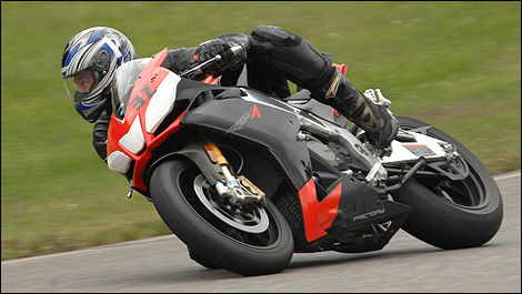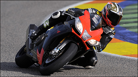 Légère, stable et précise, elle semble aussi agile qu’une 600cc. Par contre, il suffit d’ouvrir les gaz à la première ligne droite pour se rendre compte que la RSV4 ne vise pas les pilotes débutants, avec son V4 à la puissance grand «P» et des accélérations fulgurantes qui demandent des mains expertes au guidon.