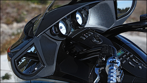 | Le poste de pilotage, digne d'un 747, dominé par les deux beaux compteurs analogues, et disposant de plus de 20 boutons pour commander les systèmes de son, radio et I-Pod, la suspension, et les diverses fonctions standard. Heureusement, on finit par apprendre après seulement quelques heures à bord. (Photo: Philippe Champoux/Moto123.com) |