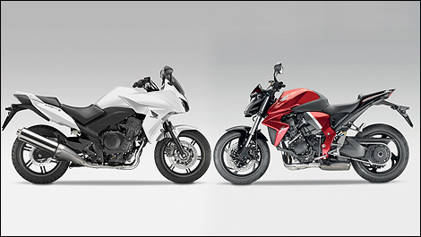 | La CBF en blanc et la 1000R en rouge, avec l'échelle respectée. La R dispose de 20ch en plus, et plus de variables réglables sur les suspensions. La CBF dispose d'un empattement plus long de 50mm, d'une selle plus plate et d'une position de pilotage moins coincée, et coûte environ 1 900 $ de moins que la R en France.(Photo: Honda) |