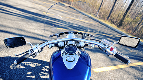 Il faut avoir de grands bras pour réussir à atteindre le guidon qui, une fois bien en mains, donne la sensation de dominer la route tant appréciée par les amateurs. Comme la plupart des pare-brises installés à la verticale, celui de la VT1300CT offre une protection non négligeable, mais produit malheureusement une turbulence agaçante à partir de 80 km/h pour mes 1,70 m. On peut heureusement améliorer cette lacune en modifiant la hauteur du pare-brise, plus haut ou plus bas selon ses préférences pour atténuer cette turbulence.