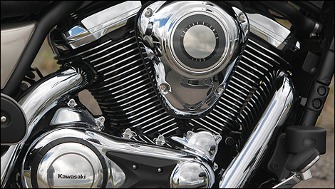La plus récente interprétation du moteur de « cruiser » à grosse cylindrée de Kawasaki se caractérise par son refroidissement par liquide, une longue course des pistons, deux cylindres en V rapprochés comptant chacun quatre soupapes et un simple arbre à cames en tête. La performance et l’efficacité énergétique sont optimisées grâce à un système d’injection moderne, à une commande d’accélérateur électronique ainsi qu’à un embrayage à glissement contrôlé («slipper clutch») lui aussi par l’électronique – un élément de sécurité essentiel sur les grosses routières.