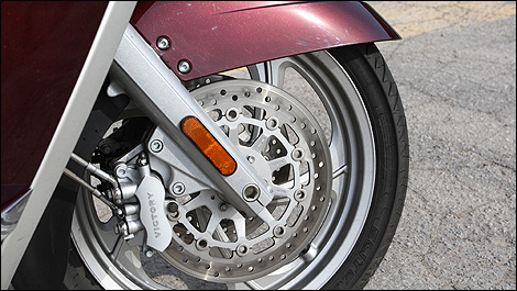 Pas d'ABS ?Le freinage est assuré par trois disques de 300 millimètres dotés d'étriers à 3 pistons à l'avant et d'un étrier à 2 pistons à l'arrière. Même si ce système est très efficace et facile à doser en freinage d'urgence, il aurait été préférable, pour une monture de ce gabarit, d'y installer un système de freinage antiblocage pour plus de sécurité.  | | Ce système est très efficace et facile à doser en freinage d'urgence. |