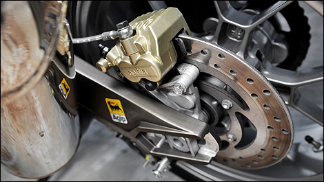 Son système de freinage de qualité est composé de disques de 320 millimètres pincés par des étriers à 4 pistons à l'avant et d'un disque et étrier à deux pistons à l'arrière.