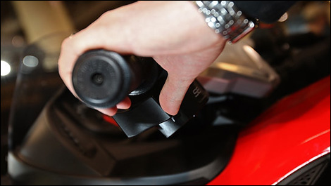 Automatique ? La boîte dite « séquentielle électronique » de la Can-Am est composée d'un jeu d'engrenages commun au modèle manuel, accouplé à un embrayage centrifuge à bain d'huile, et dont les passages de rapports s'effectuent grâce à l'électronique de bord. Cette boîte fonctionne donc sans levier d'embrayage, et on passe les rapports au moyen d'une double gâchette installée à proximité de la poignée de gauche. Naturellement, l'embrayage s'ouvre à l'arrêt et s'engage lors d'un départ arrêté. Une fois en route, le pouce monte les rapports, et l'index s'occupe de les descendre. Si on oublie de rétrograder, le cerveau de la Spyder s'occupe de rétrograder pour soi, un petit plus qui sera apprécié des conducteurs provenant du monde de l'automobile.