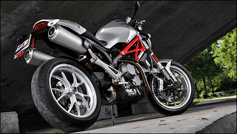 Côté apparence, la Monster 1100 nous en met plein la vue : le mono-bras offert met en vedette l’élégante (le mot est juste!) roue arrière, l’échappement haut placé et le minuscule pare-brise aux allures aérodynamiques, qui se combinent pour produire un effet unique.