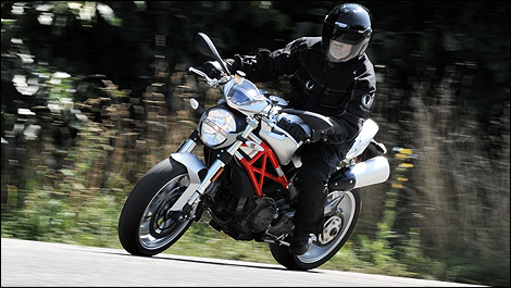 | Le comportement de la Monster 1100 tend vers le stable et sportif, et encourage le garnement au guidon à pousser un petit peu plus fort à chaque entrée en virage. Notez aussi le saute-vent des plus efficace malgré sa petite taille. |