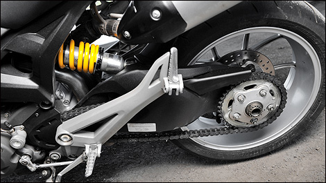 Les améliorations importantes au cadre en treillis tubulaire de la Monster 1100 marquent bien l’arrivée d’une nouvelle génération, avec de plus en plus de composantes en aluminium afin d’alléger l’ensemble tout en conservant la rigidité voulue sur une machine à la fois puissante et performante. La fourche Showa réglable et l’amortisseur Sach réglable en précharge et détente, des étriers Brembo à quatre pistons et des pneus Bridgestone BT106 orientés performance complètent une suspension efficace sans avoir recours à des éléments très chers. Et si le budget vous le permet, la Monster 1100s arrive avec fourche et amortisseur Öhlins, garants d’une efficacité supérieure, et pour un petit 2 000 $ de plus que les 13 995 $ exigés pour la 1100 de base.
