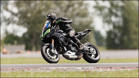 Sur la ligne droite arrière du circuit routier de l’Autodrome St-Eustache, la Multistrada 1200 dépasse facilement les 200 km/h, une vitesse qui n’a guère de sens pour un usage routier, mais qui prouve bien le niveau de performance surprenant de la bête. Les reprises en sortie de virage sont toujours très bonnes, chaque rotation de la poignée propulse l’engin à des vitesses trop élevées pour la route. Normal j’imagine, pour un moteur conçu à l’origine pour remporter le championnat mondial WSBK.