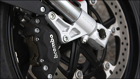 À l’avant, l’angle de chasse de 24° et donc relativement relevé, deux disques de 320 mm, des étriers Brembo à quatre pistons, un maître-cylindre radial et la roue de 17 po en alliage contribuent à l’efficacité et l’agilité de la machine ; la suspension arrière, avec sa jante de 17 po munie d’un frein de 245 mm avec un étrier à deux pistons tient bien son bout elle aussi.