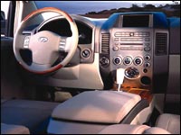 Nissan Titan, mais on l'a également doté du même moteur (un V8 de 5,6 litres, pour une puissance de 315 chevaux et un couple de 390 livrespied), de la même boîte automatique à 5 rapports et, à l'exception de sa calandre intimidante, des mêmes lignes extérieures.