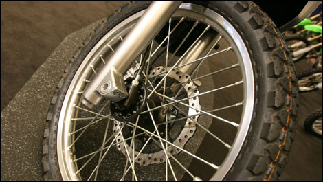 On a entièrement révisé les freins de la KLR 650 pour lui permettre d'offrir un freinage plus puissant et plus précis. Un disque à pétales, léger et de plus grand diamètre, équipé d'un étrier à 2 pistons et d'un nouveau maître-cylindre emprunté à la KX, devrait à coup sûr améliorer le freinage.