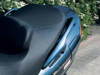 Malheureusement, la notion de confort doit se limiter à la protection éolienne et aux différents aspects pratiques sur lesquels nous reviendrons. En effet, bien que le moteur ne soit plus solidaire du bras oscillant mais du cadre conformément à une architecture de moto, les suspensions développent de sèches réactions sur chaussée abîmée. On ne peut espérer de miracle de la part d'une fourche non réglable et d'une paire d'amortisseurs qui débattent sur 100 millimètres alors qu'une suspension de moto travaille sur 8 à 9 fois plus de course. Cependant, malgré un poids à vide de 238 kilos qui complique les manoeuvres moteur coupé et une roue avant portée à 15 pouces pour augmenter l'effet gyroscopique, ce Burgman conserve une maniabilité de véhicule citadin. Seul son gabarit peut surprendre, tant en longueur qu'en largeur. Imposant, il l'est par ses prestations, sa taille et son esthétique. Ce qui explique sans doute pourquoi même certaines motos s'écartent pour lui ouvrir le passage. De face avant, celle qu'on aperçoit en premier dans les miroirs, il est bien difficile d'imaginer qu'il s'agit d'un Scooter. Seuls le profil et l'arrière de la machine en font état.