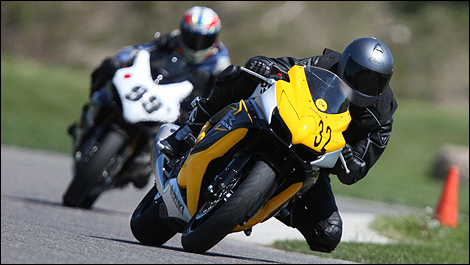 La poussée du moteur débute vraiment vers les 6000 tours/minute, se tonifie franchement à 8000 tr/min, pour ensuite exploser jusqu’au rupteur une fois les 11 000 tours dépassés. Même si ça semble inutile de tirer au-delà de 14 000 tr/min permis par le coupe-circuit pour aller plus vite (la puissance maximale arrive à 13 500 tr/min), cela n’en demeure pas moins orgasmique (du moins pour moi!). De plus, cette rallonge de régime permet de réduire le nombre de changements de rapports, en bout de ligne droite ou entre deux virages successifs par exemple.