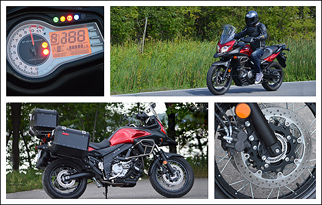 La partie cycle change peu, la V-Strom 650X ABS utilise un cadre en aluminium, une fourche traditionnelle et un monoamortisseur réglable à l’aide d’une molette placée du côté droit. Le grand changement provient de nouvelles jantes à rayon DID de type sans chambre à air. Des jantes d’excellente qualité qui rehaussent le style aventurière de cette hybride. L’ensemble « X » inclut également des protège-mains, un protège-tuyau d’échappement, 3 valises et un déflecteur sur le parebrise. Ce dernier comprend une possibilité de réglage presque infini. Au rayon des options; la béquille centrale, le support GPS et les poignées chauffantes.