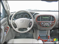 Prendre place à bord du Sequoia n'est pas aussi pénible que de grimper dans Hummer H2, mais demande tout de même un petit effort physique. Les marchepieds offerts de série sont d'ailleurs présents afin d'accommoder ceux qui ne seraient pas nécessairement en mesure d'escalader l'Everest. Une fois à bord, on retrouve une parfaite symbiose de saveur américaine et de qualité de construction et de finition japonaise. Les matériaux utilisés sont de loin supérieurs à ce qui se retrouve dans les Tahoe, Expedition, Durango et Armada, et l'assemblage est aussi rigoureux que dans la plus onéreuse des Lexus. Cependant, l'habitacle reflète bien le caractère moins « show off » du Sequoia, en offrant une planche de bord totalement sans éclat. Noblesse oblige, la version Limited reçoit tout de même quelques boiseries, qui ne sont malheureusement pas faites de bois !