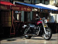 Bien que Triumph annonce une puissance et un couple exactement identiques à ceux de l'America, en selle, l'impression est tout autre. Le souvenir que j'ai de l'America, au chapitre du moteur, n'a rien d'excitant puisqu'il s'agit d'un Twin parallèle très doux, très silencieux et peu puissant qui n'a pas vraiment de caractère. La Speedmaster bénéficie de modifications légères à sa mécanique, mais elles suffisent à littéralement la transformer. D'après le constructeur, ces altérations se limitent à une dent en moins sur le pignon arrière, à une carburation revue et à des arbres à cames légèrement modifiés. Le résultat est louable puisque la mécanique tire maintenant avec empressement jusqu'à sa zone rouge de 8000 tr/min, et semble même avoir un second souffle à partir de 6000 tr/min. LAmerica s'essouffle avant même d'arriver à ce régime... En fait, sans qu'il soit moins doux, le Twin britannique est considérablement plus présent sur la Speedmaster, ce qui ajoute une dimension non négligeable à l'agrément de conduite. J'ai l'impression que le niveau de performance disponible permettrait à la Triumph de bien se débrouiller face à la concurrence japonaise à moteur V Twin de 750 et 800 cc qui partage avec elle la catégorie, ce que je n'aurais pu affirmer dans le cas de l'America.