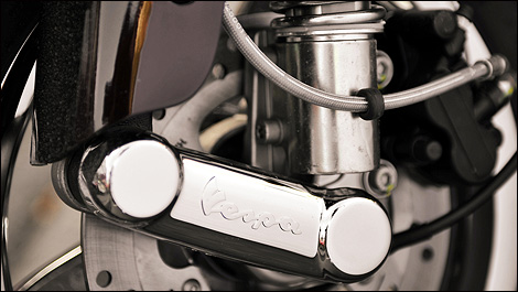 Vespa utilise cette suspension avant monobras depuis les années 50, ici accompagnée d'une belle jante chromée. Photo: Matthieu Lambert/Moto123.com)