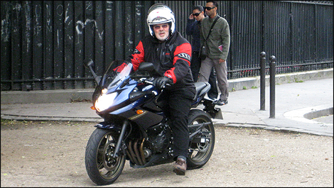 | Des fois, on doit briser certaines lois et rouler sur des trottoirs pour trouver "la" photo, comme ici au pied de la tour Eiffel. |
