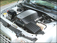 lurking beneath the hood fires up like any other smooth-running overhead-valve V8. It's extremely quiet, other than a respectfully muted exhaust note at idle and takeoff, but otherwise its potential is nearly imperceptible within the parameters of conservative usage. In fact, it might just be a bit too civilized in my opinion. It's not until a heavy right foot dominates the driving pattern that the HEMI speaks up for itself - and that's disappointing. I recently road tested Pontiac's Bonneville GXP, equipped with a detuned version of Cadillac's highly respected Northstar V8, and was more than smitten with the "burble" emitted from its twin pipes. At idle, the GXP lets everyone know that more than six cylinders are firing beneath the bonnet. Sink the right foot and a GXP sport tuned exhaust note sings out like Joe Cocker at full volume, but with much more refinement than old Joe has.
