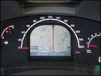 the centre of the gauge cluster, inside the speedometer. The display is very small due to its location and not particularly user friendly. Its controls are a series of small buttons located in the upper left-hand corner of the instrument panel. The positioning of the entire system makes it impossible for the passenger to actually use or modify it. I have found it very useful in the past when my passenger is able to make changes while I am driving. I will admit that the driver does not have to alter his/her line of sight as much when looking at the Pacifica's screen.