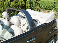 enable owners to structure a PT Cruiser convertible to fit perfectly with their needs and desires. My GT tester featured soft leather upholstery, a power-height adjustable driver's seat, side airbags, compass and outside temperature readouts, plus traction control and cruise control. Chromed alloy rims brightened the outside appearance and gave the PT a bit of a hotrod look, which is further emphasized when the PT's soft-top is in place. The low-slung, nicely contoured lines of this roof are visually dramatic, again adding to the customized hotrod appearance. By the way, the roof is one of the snuggest fitting softies in the business. It seals tightly and its heavy insulation keeps the PT's cabin quiet and cozy when Mother Nature chooses to water her garden.